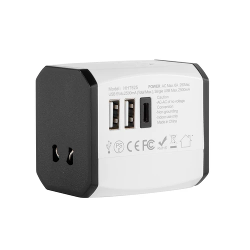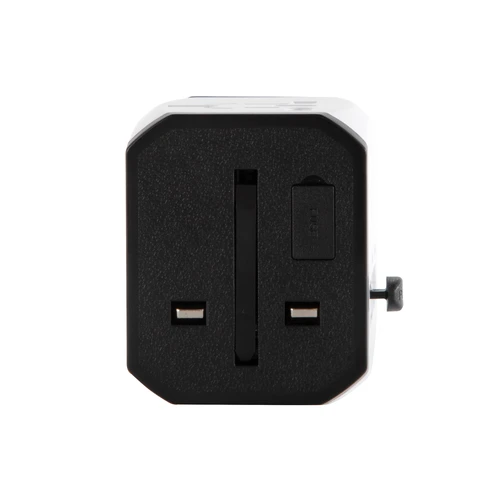 Tu compañero de viaje que no puede faltar.Adaptador universal de viaje. Tres enchufes: dos de la Unión Europea y uno del Reino Unido. Tipo de patas: redondas, cruzadas y paralelas. Toma múltiple. Puertos USB y USB C. Potencia: 100-250V, 6A MAX. Salida total usb: 5V/2.4A máximo por puerto. Medidas: 6 x 5,5 x 4,5 cm.
