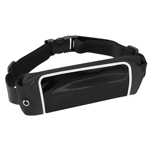 Deluxe Banano impermeable modelo "Jog", en tela Polyester Stretch 210 Waterproof. Incluye banda-cinturón elasticado ajustable color negro, cierre-eclair posterior impermeable, salida para auriculares y ventana de PVC clear para smart-phone, compatible Samsung, i-Phone, Xperia y en general todas las marcas, modelos y tamaños. Bandas reflectantes color plateado en ambos lados. Ideal para practicar deportes.
