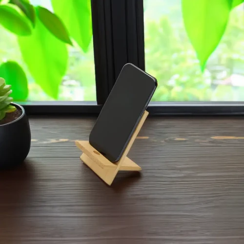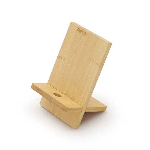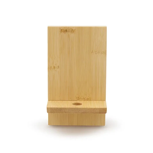 Soporte para teléfono fabricado en bambú. Incluye un orificio que permite el paso del cable facilitando la carga del dispositivo mientras está en uso.