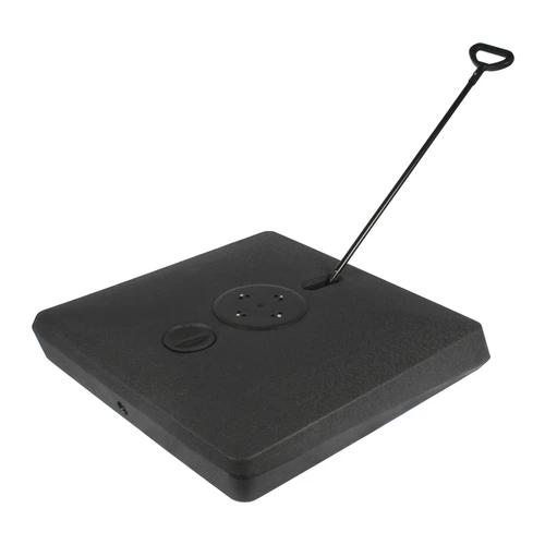 Base cuadrada de plástico rígido, rellenable (con arena o piedrecilla, para darle mayor peso), con una capacidad total de 140kg. Viene con 4 ruedas sobre estructura de Acero y manilla tiradora retráctil, para fácil traslado y movimiento del quitasol.