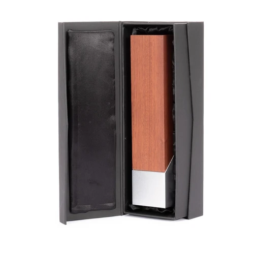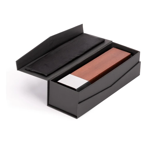 Elegante Trofeo de Madera barnizada con base de acero plateado, modelo "LUKAS", con forma de bloque. Presentación en caja de cartón forrado negro con cierre imantado, interior acolchado de espuma y tela poliéster satinado negro, con troquel.