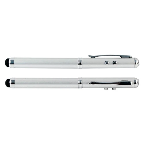 Bolígrafo metálico multi-función 4 en 1. Incluye bolígrafo, linterna LED, puntero láser y NUEVO puntero "Touch-Screen" para pantallas táctiles. Presentación en estuche de aluminio. Escritura Azul.