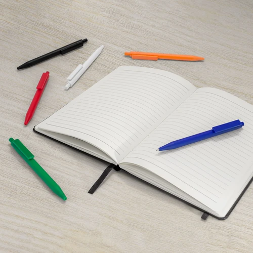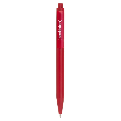 Plástico ABS. Bolígrafo retráctil. Cuerpo y clip plásticos del mismo color, cuerpo acabado mate y clip acabado brillante. Tinta negra. Amplia área de impresión.