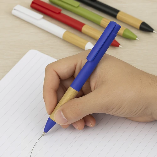 Diseño simple, estilo sostenible.Bolígrafo retráctil. Cuerpo, puntera y pulsador de plástico reciclable. Agarre de bambú. Pintura acabado mate.Medidas: 1,1 x 14,3 cm