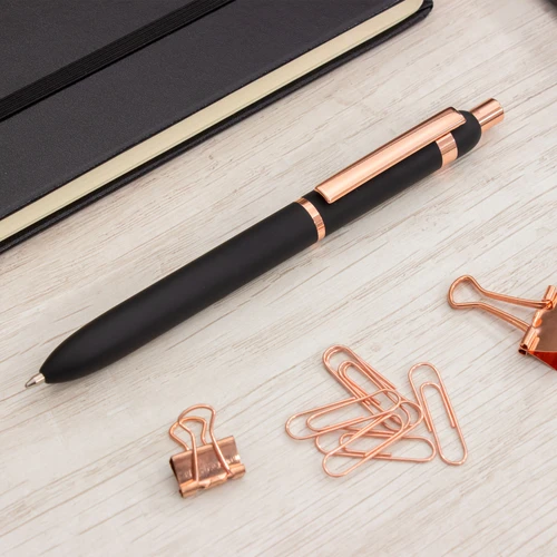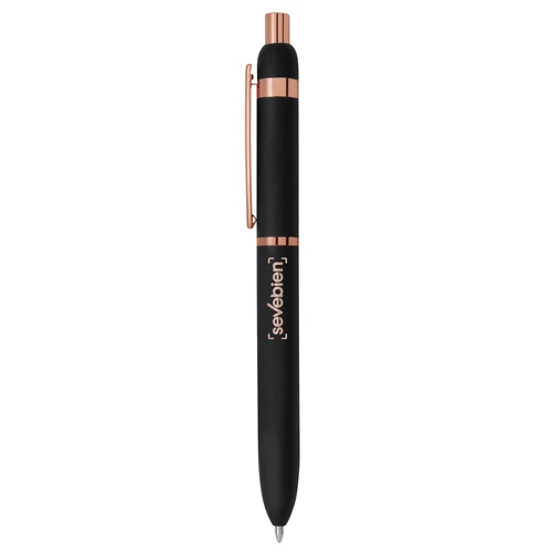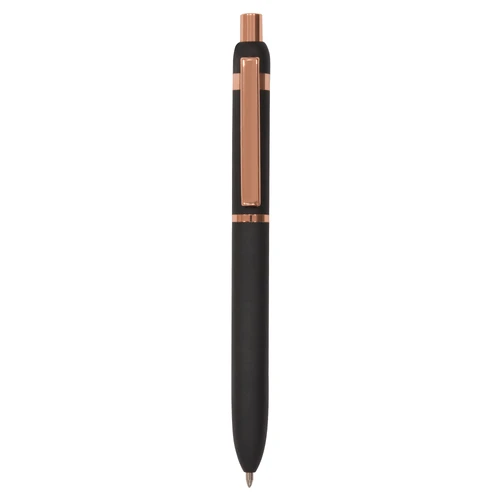 Metal. Cuerpo de aluminio, acabado engomado color negro, muy suave al tacto. Bolígrafo retráctil. Clip, botón y anillos metálicos color cobre. Tinta Azul. Decapa cobre tanto en el cuerpo como en la tapa (grabado exclusivo en nuestro taller). Presentación en caja de regalo.