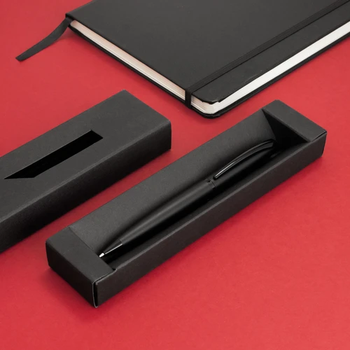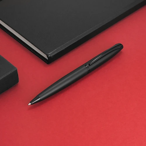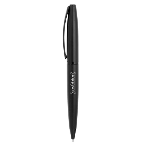 Regala precisión y elegancia en cada trazo.Bolígrafo con apertura giratoria. Cuerpo de aluminio con acabado mate. Clip, anillo central y puntera de hierro con acabado brillante. Refill metálico de origen alemán. Tambor superior con revestimiento galvánico. Medidas: 0,9 x 13,5 cm.