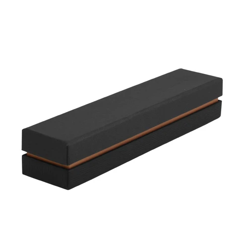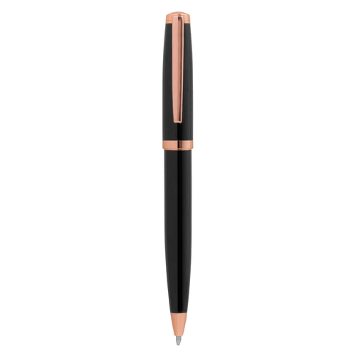 Metálico. Cuerpo color negro laqueado. Puntera, clip y anillo metálico en rose gold. Apertura giratoria. En la parte superior destape electroplateado rose gold. Tinta azul. Presentación en caja de regalo color negra, con detalle rose gold metalizado en su interior.