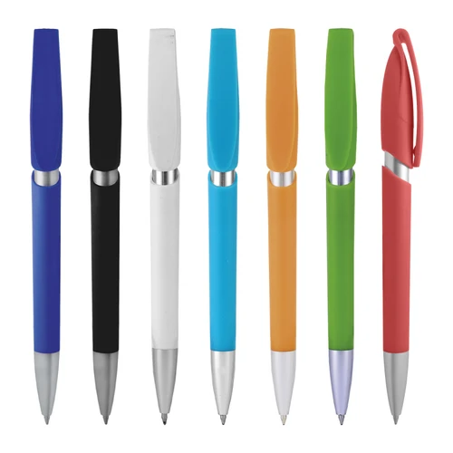 Plástico. Apertura retráctil con pulsador. Clip plástico, color plata en punta y cuerpo. Tinta negra.