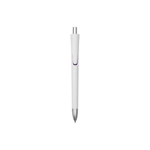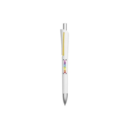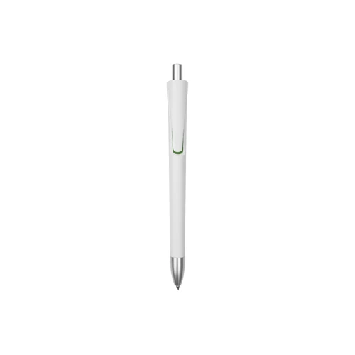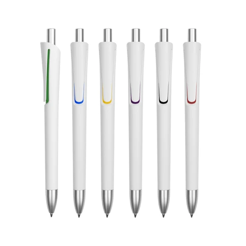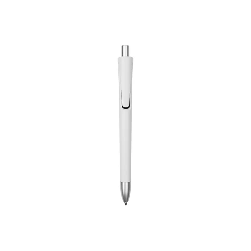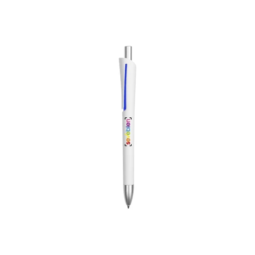 Plástico. Cuerpo blanco mate. Clip, punta y pulsador color plata. Debajo del clip detalle de color. Tinta azul.