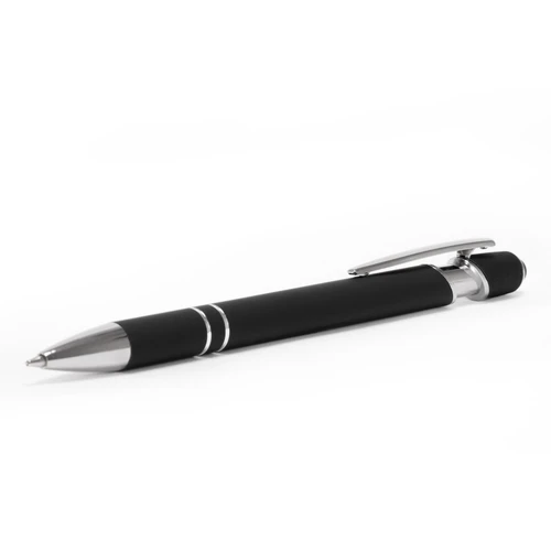 Bolígrafo metálico con cuerpo negro terminación "rubber" y terminal "touch-screen". Escritura azul.