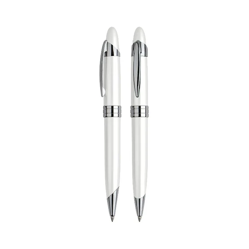 Bolígrafo metálico modelo "White Pearl", con terminales cromados plata. Escritura azul.