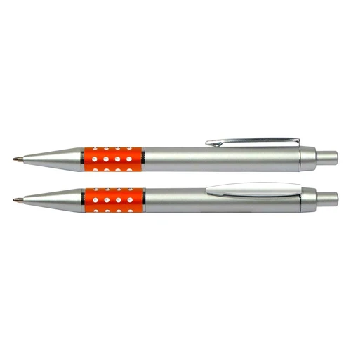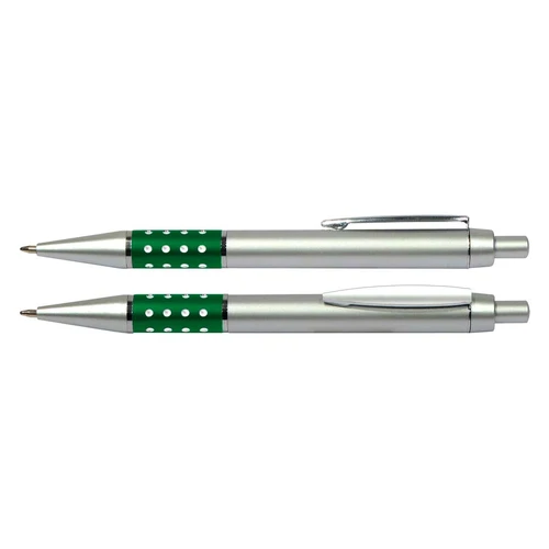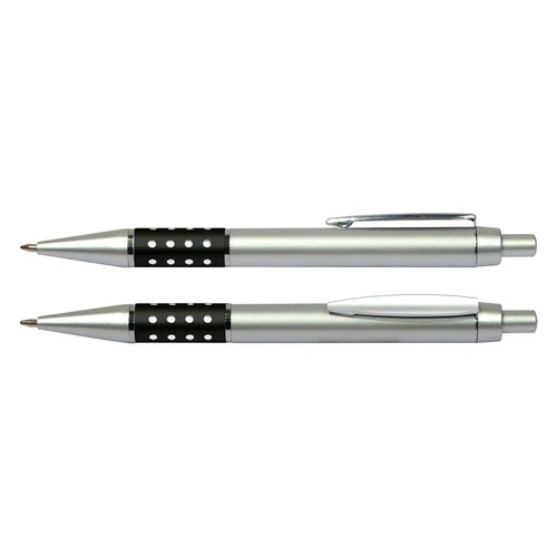 Bolígrafo Plástico Metalizado modelo "Alum", con anillo metálico con orificios. Escritura azul.