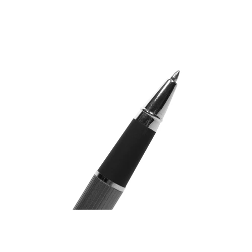 Metal. Cuerpo color plata con detalles, capuchon con clip plata brillante. Tinta gel color negra. Decape color plata. Presentación en caja de regalo.