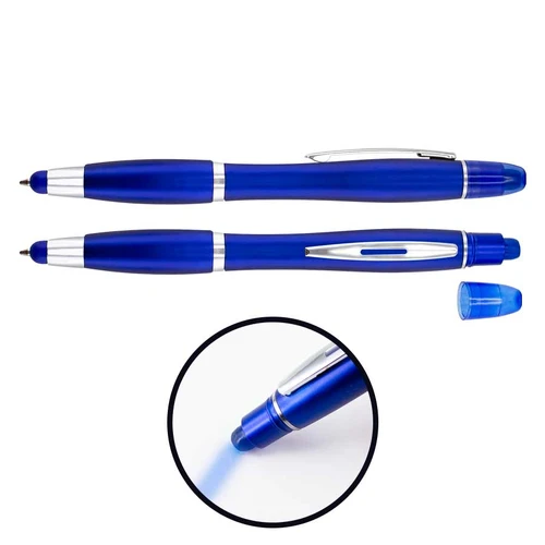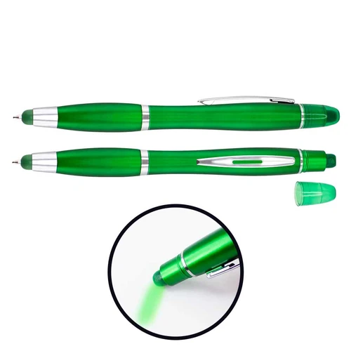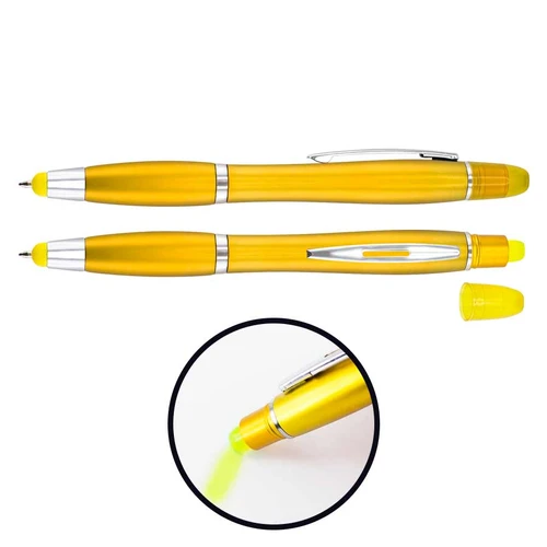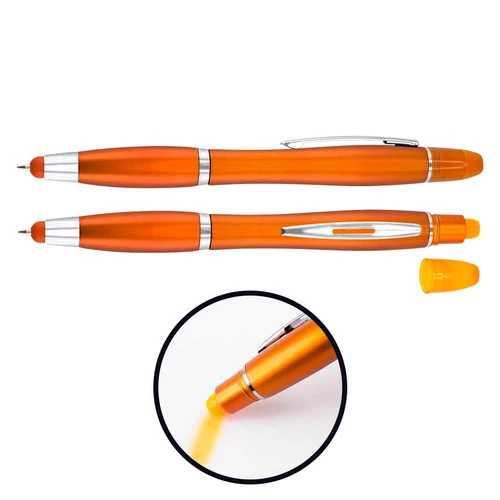 Bolígrafo plástico con cuerpo de color y puntero screen-touch al tono. Incluye práctico destacador (resaltador) de cera de color. Escritura azul.