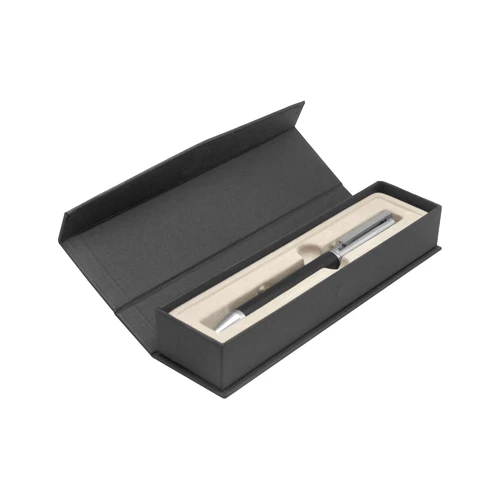 Metálico. Bolígrafo con apertura giratoria. Destape acero en la parte superior e inferior. Cuerpo color negro. Clip, tambor superior y puntera color plata. Tinta azul. Presentación en estuche con cierre magnético.