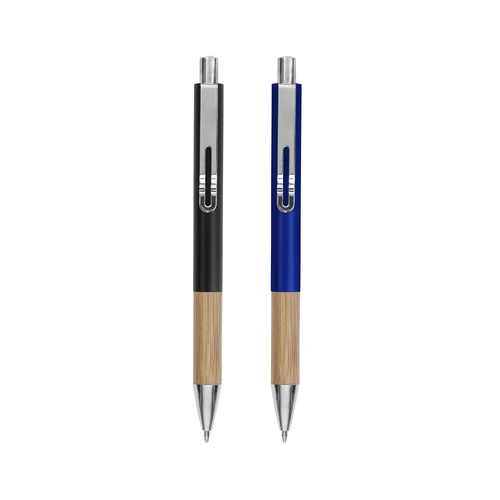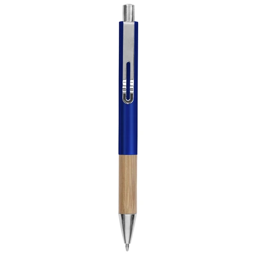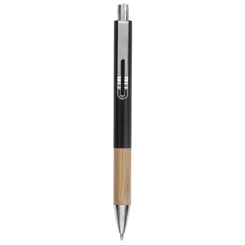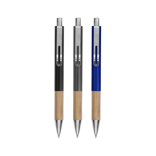 Metal. Cuerpo de aluminio en diferentes colores. Grip de bambú. Clip metálico. Pulsador y puntera plásticas color plata. Tinta negra. Decape color plata.