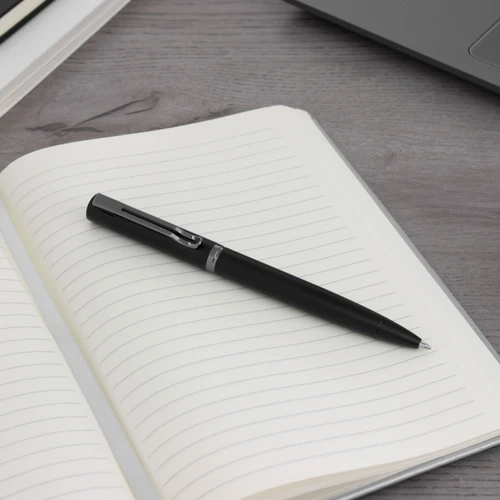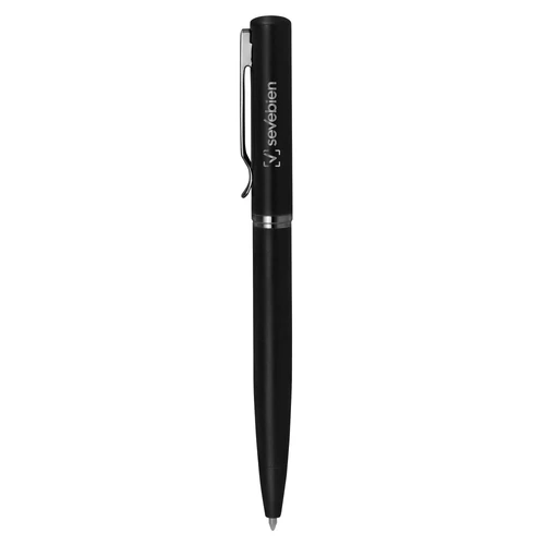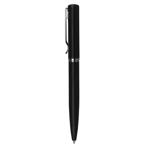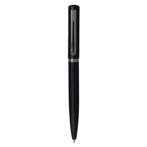 Estilo moderno.Bolígrafo con apertura giratoria. Cuerpo metálico en negro mate. Parte superior de hierro y parte inferior de acero inoxidable. Destape electroplateado en la parte superior. Recarga Parker metálico. Clip y anillos metálicos color gun.
