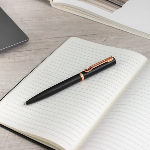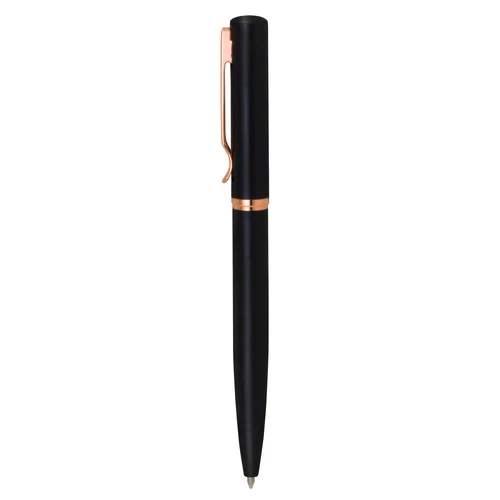 Lujo y sofisticación.Bolígrafo con apertura giratoria. Cuerpo metálico en negro mate. Parte superior de hierro y parte inferior de acero inoxidable. Destape electroplateado en gold rose en la parte superior. Recarga Parker metálico. Clip y anillos metálicos color gold rose. Medidas: 13,5 cm.