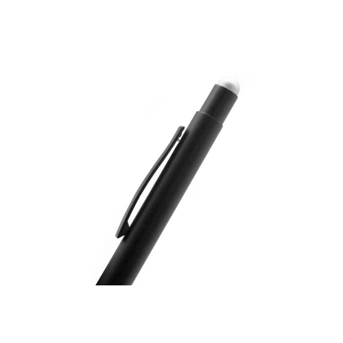 Metálico. Pulsador touch color plata. Clip metálico. Cuerpo negro mate. Destapa electro plateado en parte superior e inferior del bolígrafo.