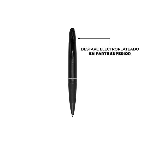 Metálico. Bolígrafo touch. Cuerpo color negro mate, electroplateado en parte superior. Clip metálico negro brillante, detalle en color plata. Apertura giratoria.