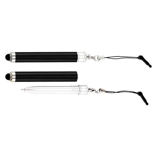 Bolígrafo "Touch-Screen" con cuerpo plateado, tapa de color metalizado y goma posterior negra para pantalla táctil. Incluye práctico soporte plástico para insertar en la salida de auricular del iPhone. Escritura azul.