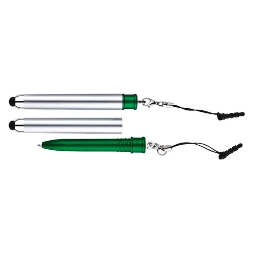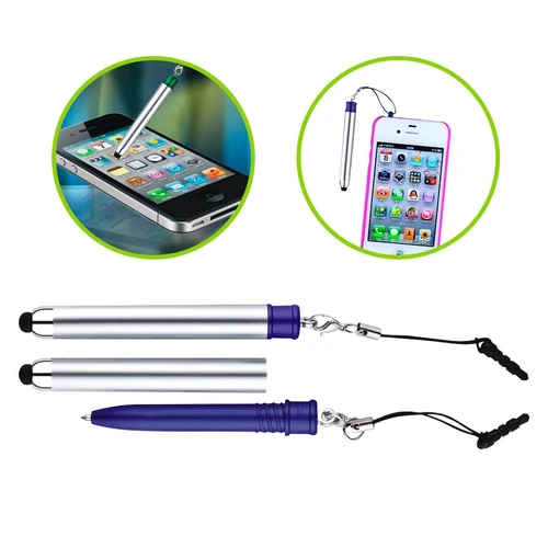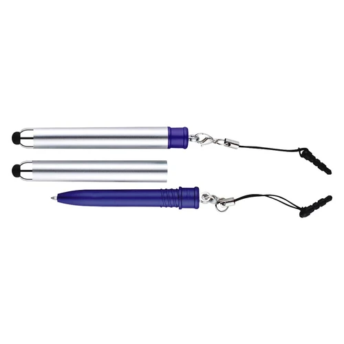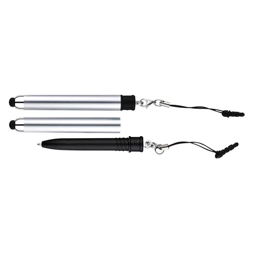 Bolígrafo "Touch-Screen" con tapa plateada y goma posterior negra para pantalla táctil. Incluye práctico soporte plástico para insertar en la salida de auricular del iPhone. Escritura azul.