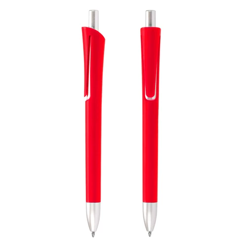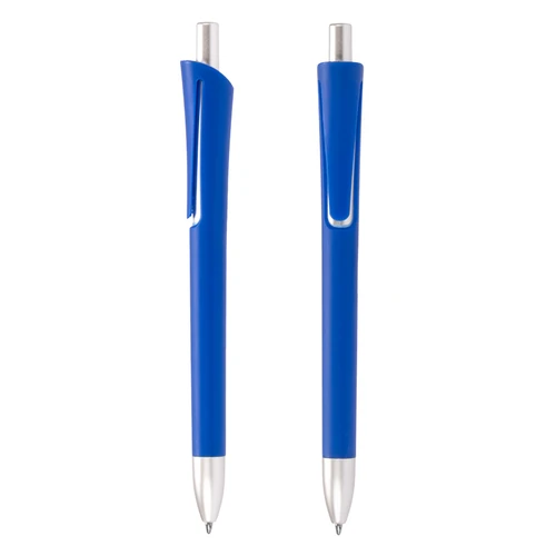 Bolígrafo plástico con cuerpo de color mate y terminales plateados. Escritura azul.