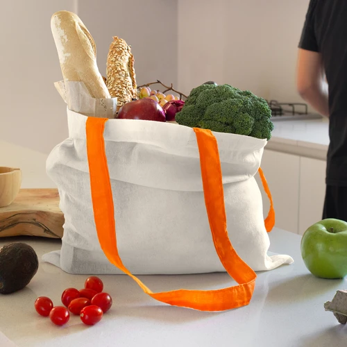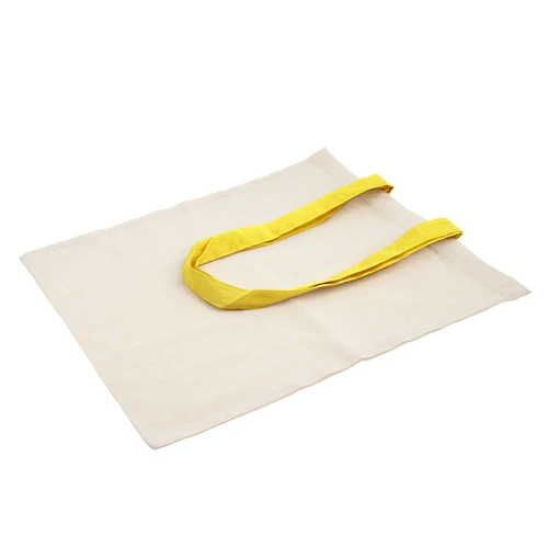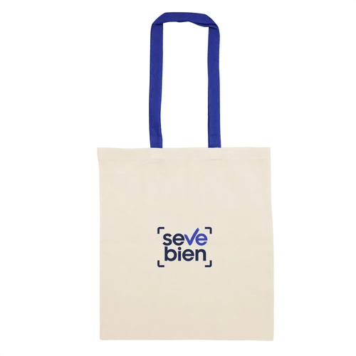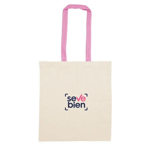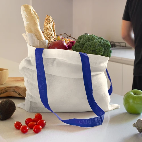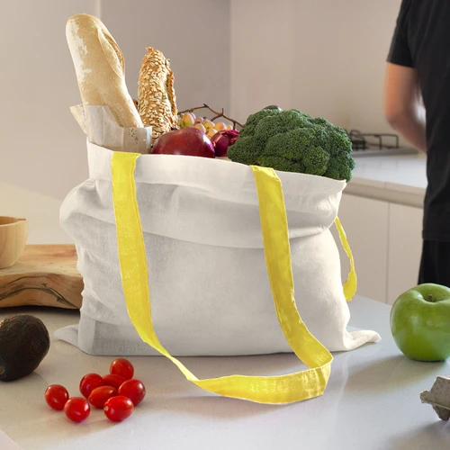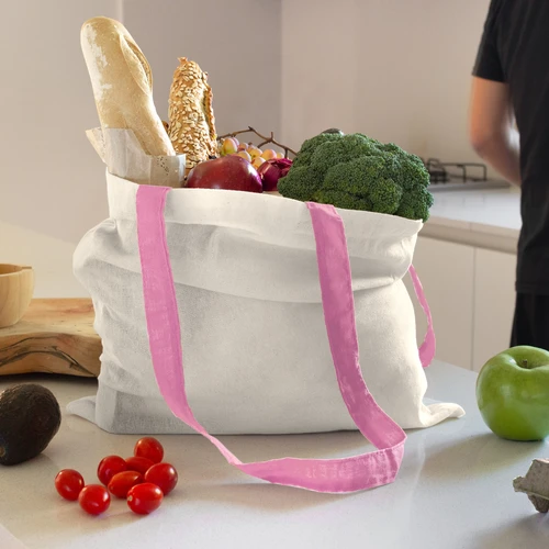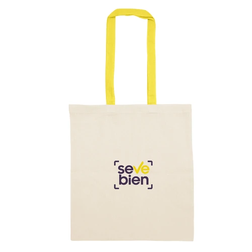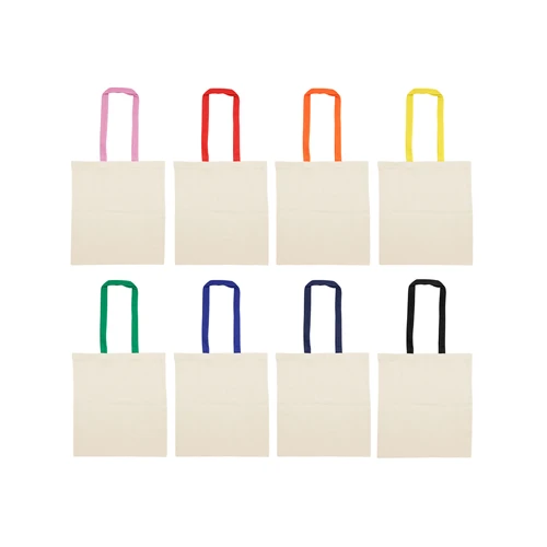 Estilo en tus compras.Bolsa reutilizable color natural con manijas de diferentes colores. Manijas cosidas de 70cm x 2,5 cm.Medidas: 38 x 42 cm.