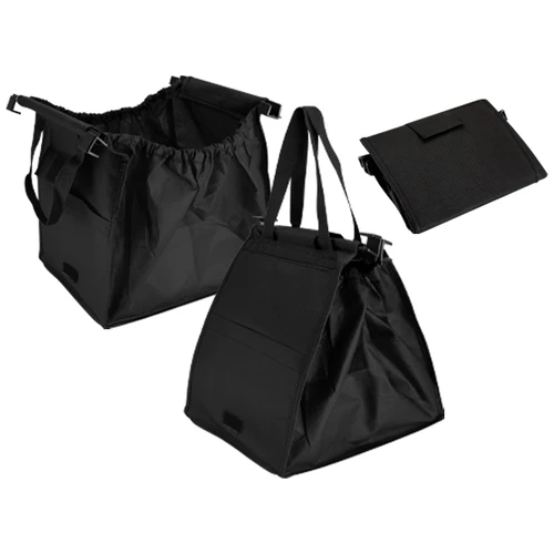 Bolsa reutilizable tela no tejida (TNT) reforzada de 100g/m2, modelo "Cart". Cuenta con 2 asas de 40cm. c/u aprox. Contiene 2 soportes plásticos rígidos negros, para enganchar en las paredes laterales de los carros de supermercados tradicionales. Sistema de cierre pestaña con velcro, bolsillo lateral y frontales superiores elasticados para maximizar la superficie de apertura sobre el carro. 100% plegable para fácil transporte y guardado.