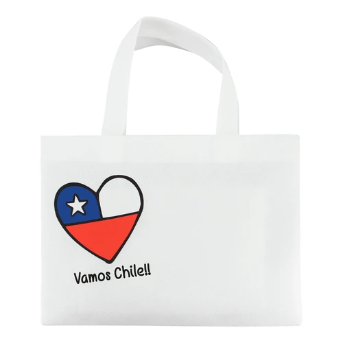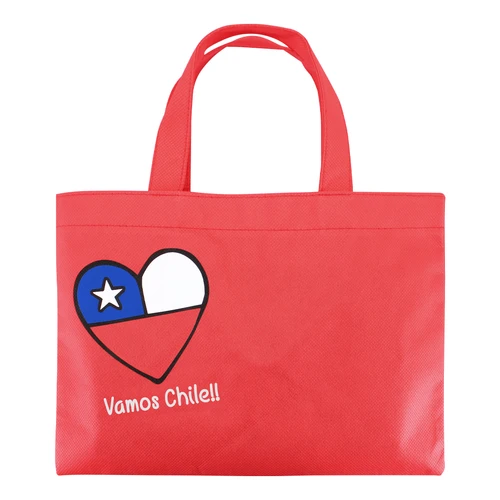 Bolsa reutilizable de Tela No Tejida (TNT) de 80 g/m2. Cuenta con 2 asas de 30cm. c/u aprox. Incluye impresión "Vamos Chile" a 3 colores, en el frente.
