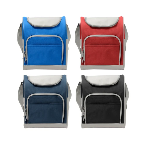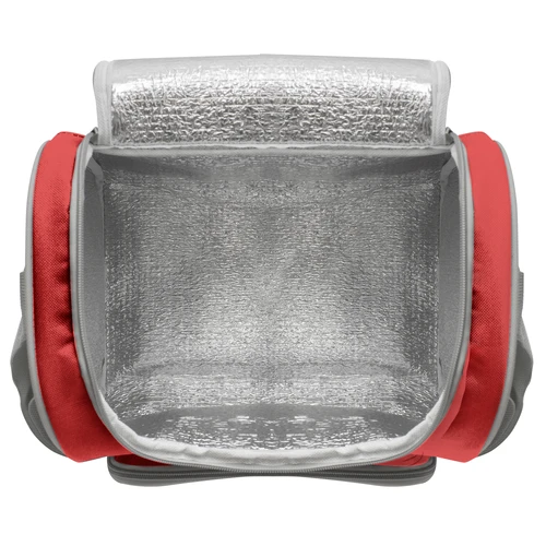 34 x 25 x 19 cm. Capacidad 16l. Polyester 600D. Bolso térmico. Interior totalmente recubierto de aluminio. Bolsillo frontal, correa extensible y cierres metálicos con tira cierres de cordón.