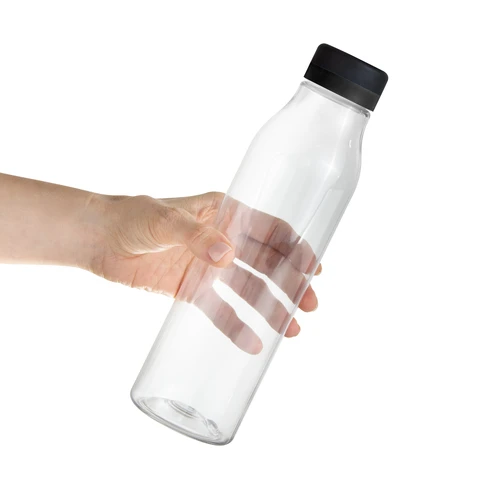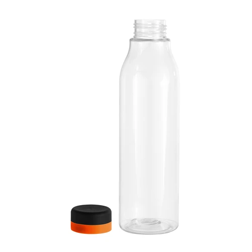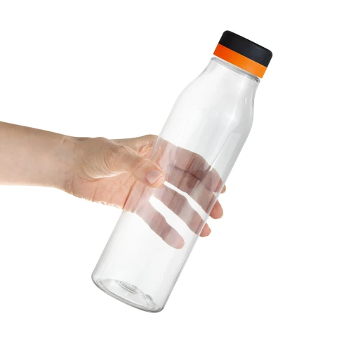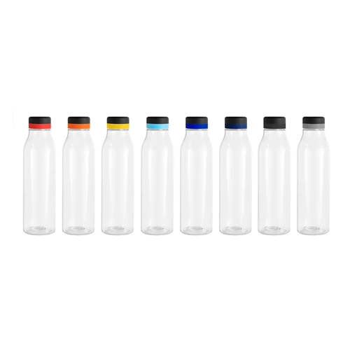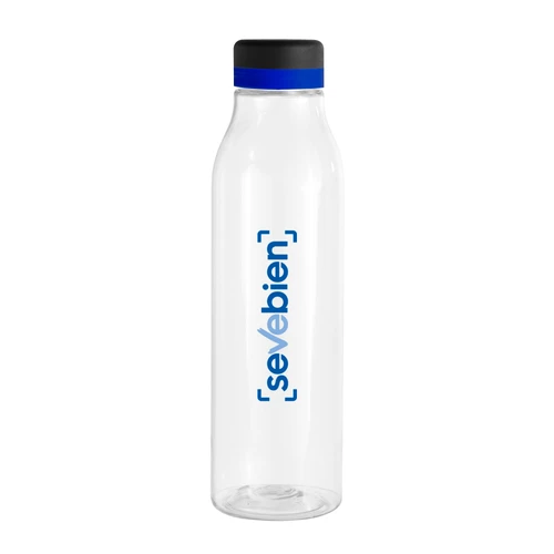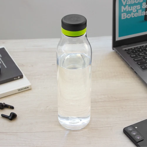 ¡Tu botella, a tu manera!Botella de plástico transparente con tapa a rosca color negro mate con anillo de silicona de diferentes colores.Medidas: Ø 7 x 24,5 cm.