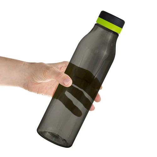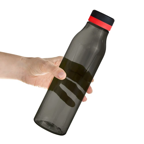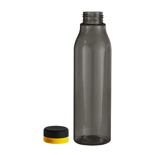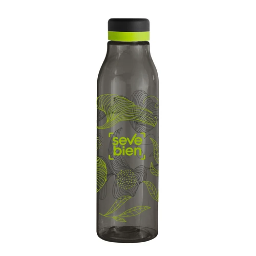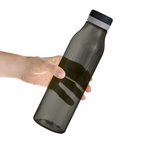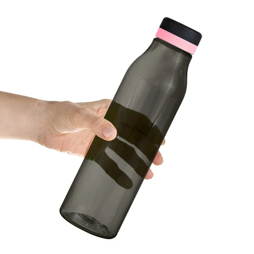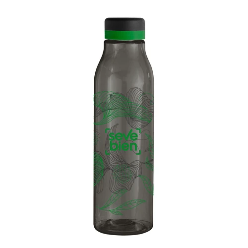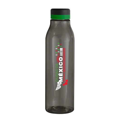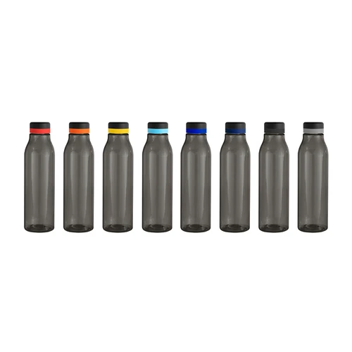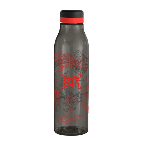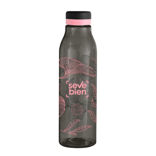Única en su estilo.Botella de plástico color negro con tapa a rosca color negro mate con anillo de silicona de diferentes colores.Medidas: Ø 7 x 24,5 cm.