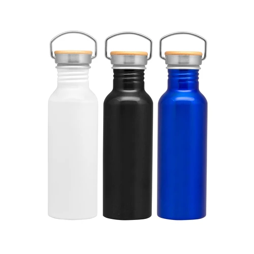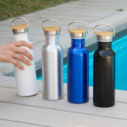 Ø 7,3 x 24 cm. Capacidad 750 ml. Aluminio. Tapa de acero con manija metálica rebatible y detalles en bambú. Anillo de silicona antiderrame. Presentación en caja de regalo Kraft