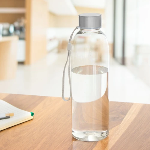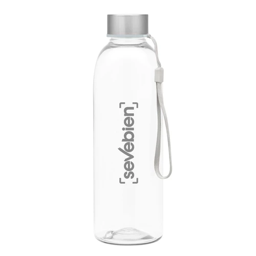 Ø 7 x 23 cm. Capacidad 780 ml. Peso de la botella 70 g y de la tapa 15g. Material PET Cristalino. Botella de plástico transparente con tapa a rosca de acero inoxidable, anillo de silicona antiderrame y correa para transportar. ATENCIÓN Botella y tapa se entregan por separado. / No utilizar con bebidas gaseosas ni líquidos calientes. / El manejo de este producto es delicado. / No exponer al sol y temperaturas altas por tiempo prolongado.