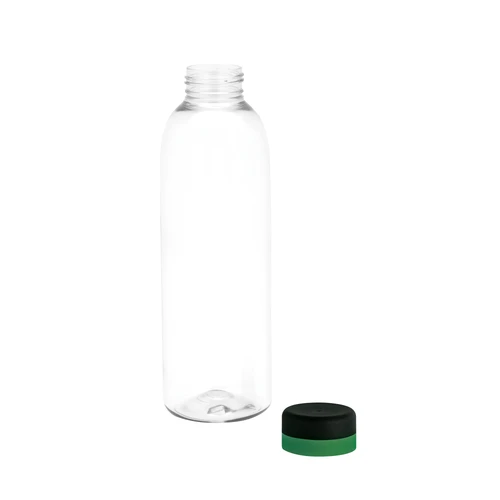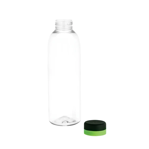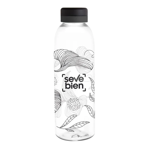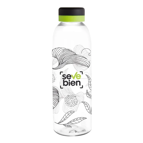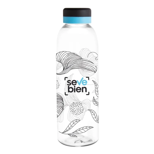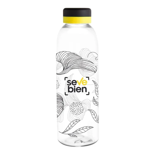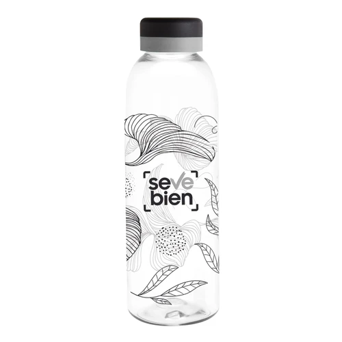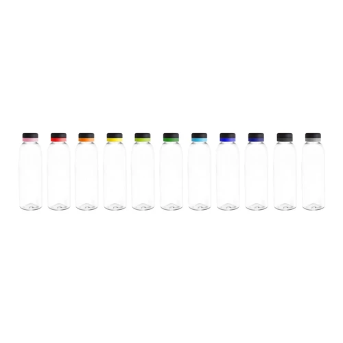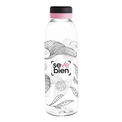 Translúcida y moderna. Botella de plástico transparente con tapa a rosca color negro mate con anillo de silicona de diferentes colores.Medidas: Ø 7 x 23 cm.