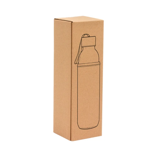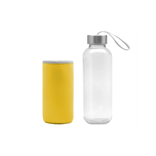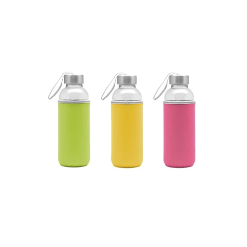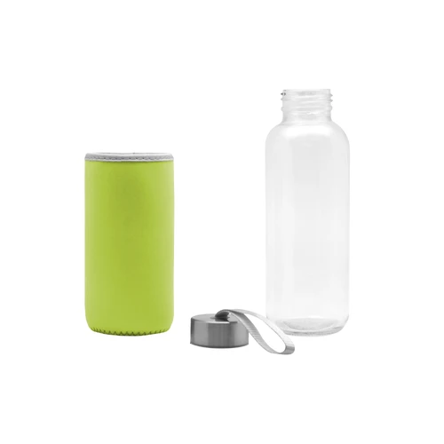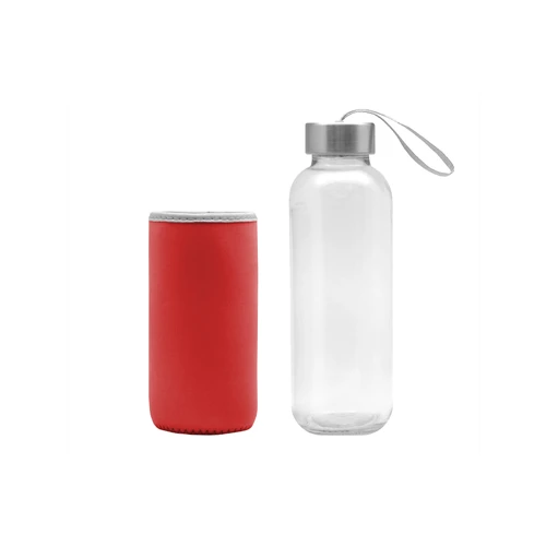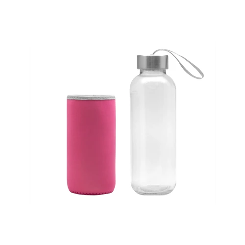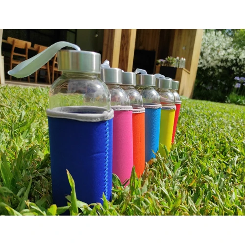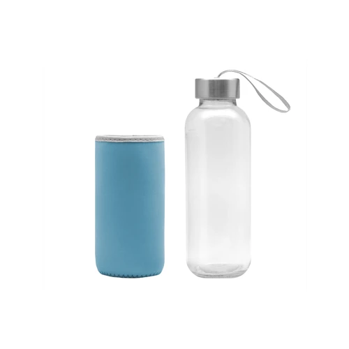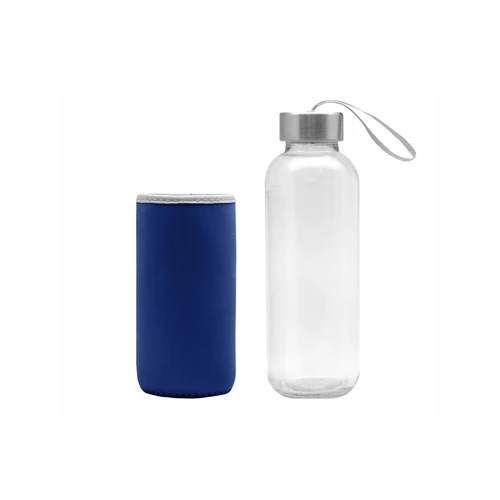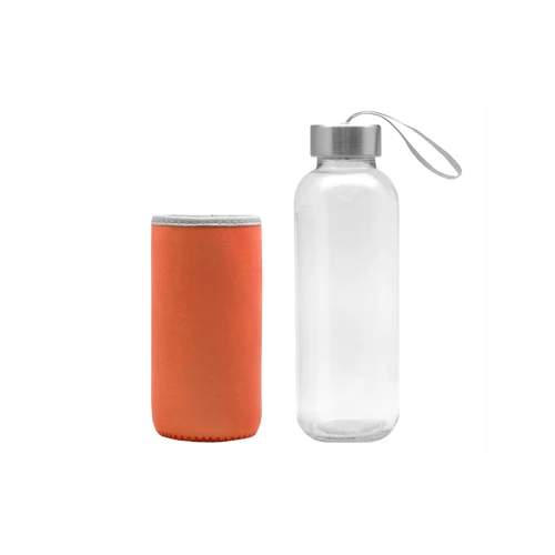 Ø 5,5 x 19,5 cm. Capacidad 440 ml. Vidrio. Cuerpo traslúcido. Funda de neopreno para proteger la botella y mantener la temperatura de las bebidas. Tapa de acero inoxidable con tira de tela. Botella apta para microondas y lavavajillas. Tapa y funda no pueden ser expuestos a estos electrodomésticos. Presentación en caja de regalo.