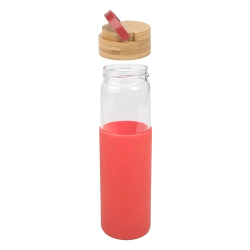 Botella de vidrio translúcido con funda de silicona de color, con tapa redonda twist-off de Bamboo y asa plástica. Producto BPA FREE, para el contacto con líquidos y alimentos. Capacidad 600ml. Presentación en bolsa plástico burbuja + caja de regalo de cartón kraft.