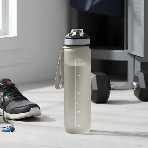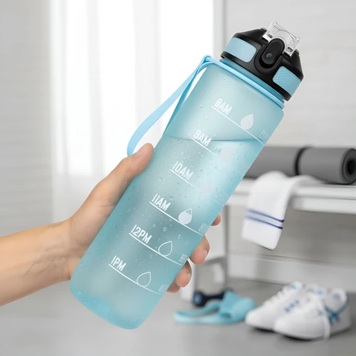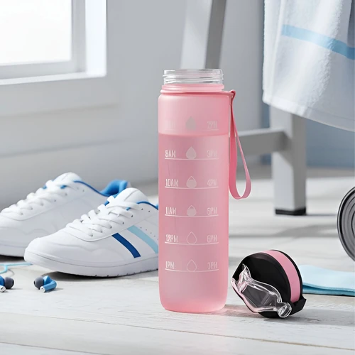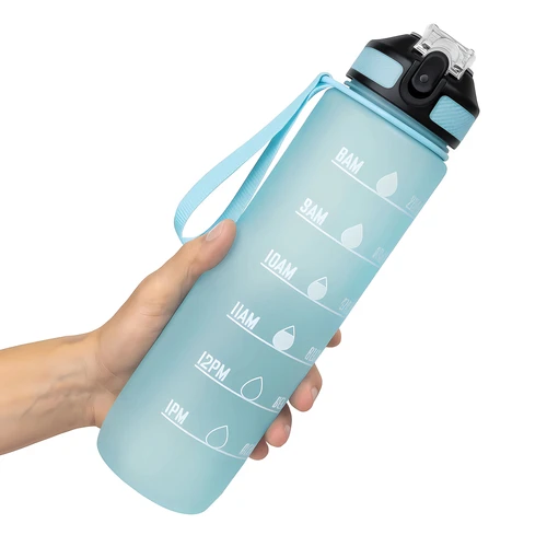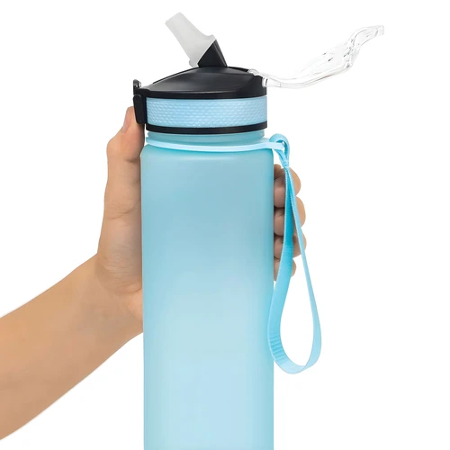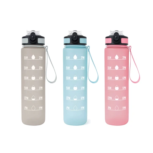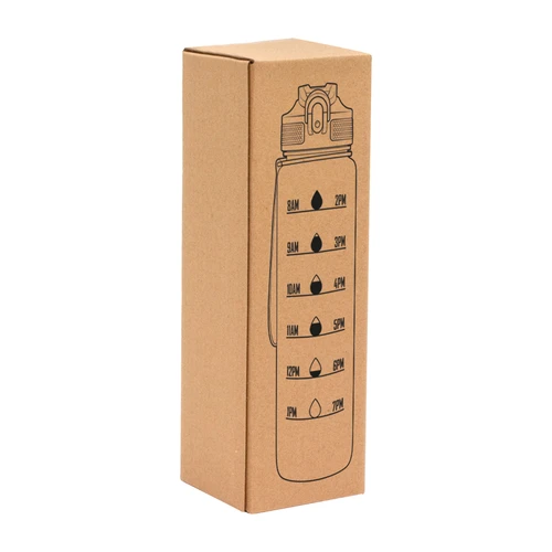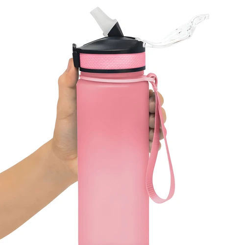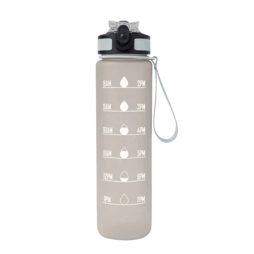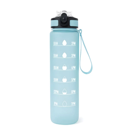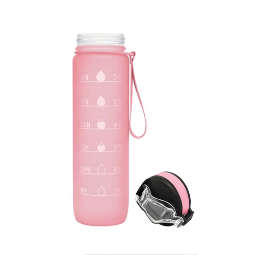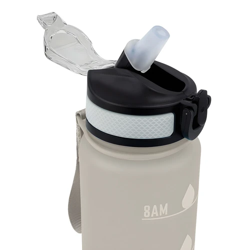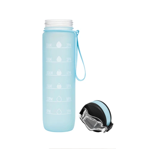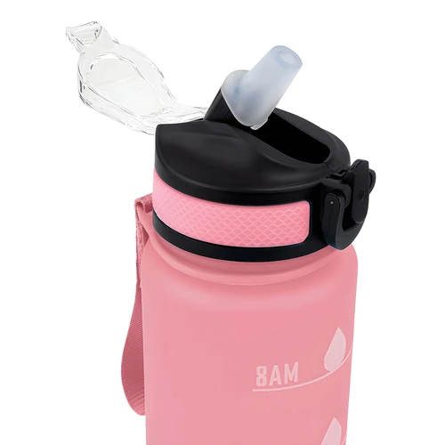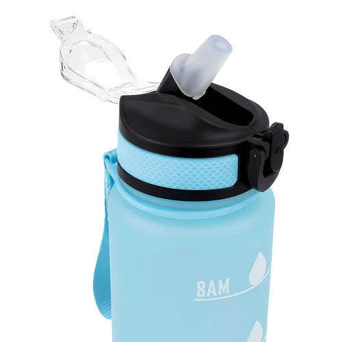 Tu compañera de cada desafíoBotella con marcador de tiempo y medida. Color pastel con acabado frost. Tapa plástica combinada en color negro con el de la botella. Apertura rápida, boquilla transparente rebatible y sorbete incluído. Correa del mismo color de la botella.Medidas: Ø 7 x 28cm. (con tapa)