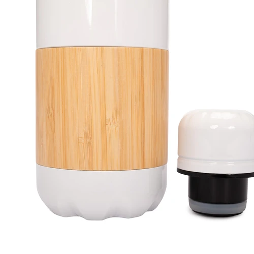 ESTOCOLMO es una botella de acero inoxidable reciclado con un diseño limpio y atemporal. Con capacidad de 500 ml y doble pared para conservar la temperatura de tus bebidas, combina practicidad y elegancia en cada detalle. Su cuerpo blanco brillante y el elegante recubrimiento de bambú aportan una estética natural que conecta con hábitos responsables. La tapa de rosca metálica asegura un cierre hermético y duradero. ESTOCOLMO es ideal para marcas que desean proyectar sobriedad, sostenibilidad y estilo con cada sorbo.