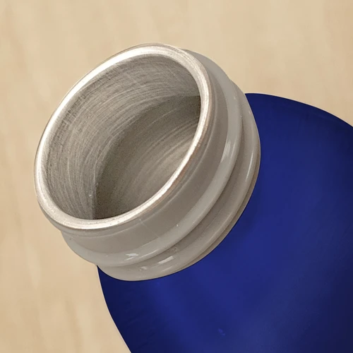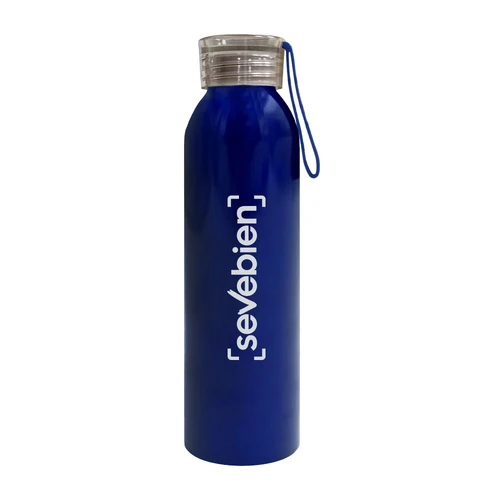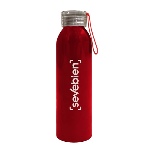 Ø 6,6 x 23,2 cm. Capacidad 600 ml. Aluminio. Botella de aluminio con cuerpo color. Tapa transparente con tira de silicona (de 8 cm) del mismo color que el cuerpo de la botella. Cuerpo de botella recubierto con pintura especial para facilitar la impresión del producto. Presentación en caja de regalo.