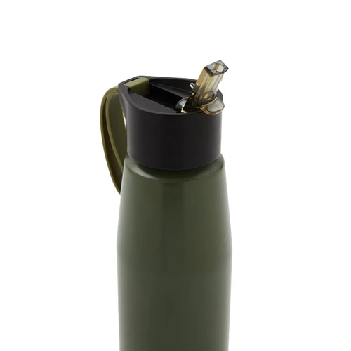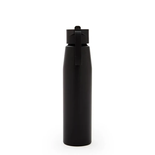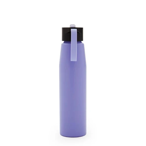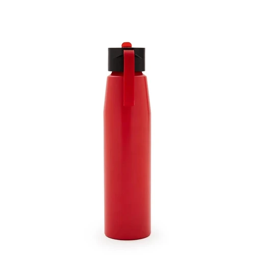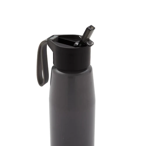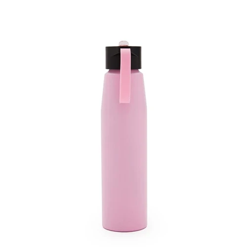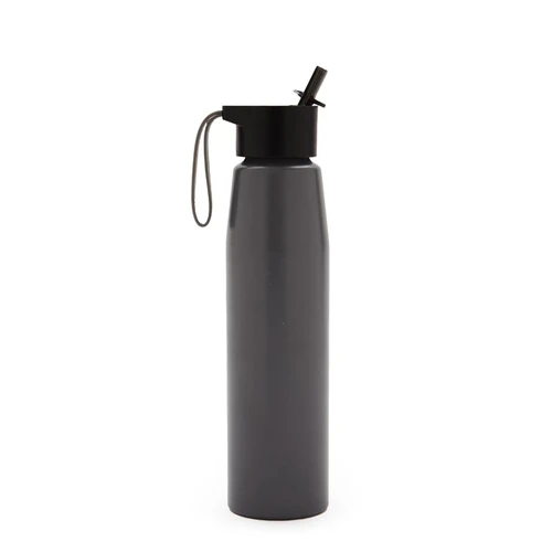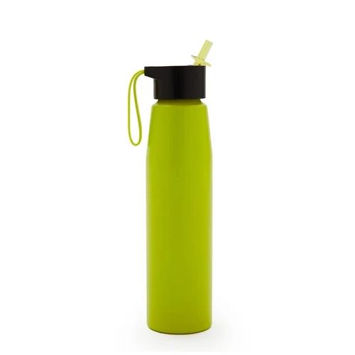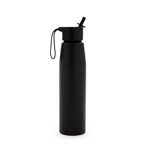 Botella de aluminio con tapa de PP negra a rosca con boquilla de PS y sorbete PE. Cuenta con una correa de silicona a tono con el color elegido para facilitar el agarre.