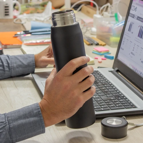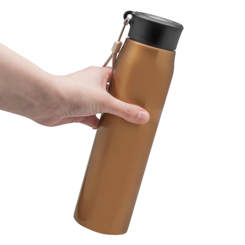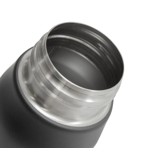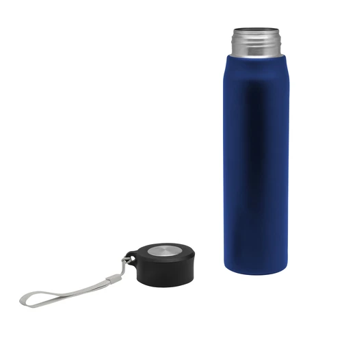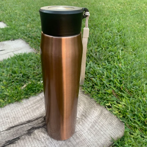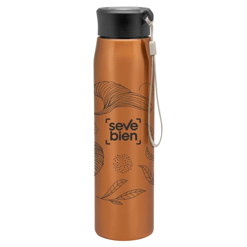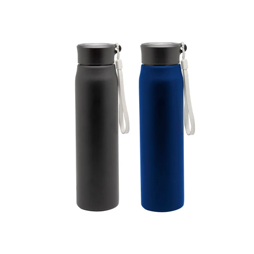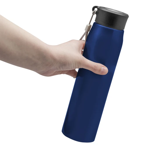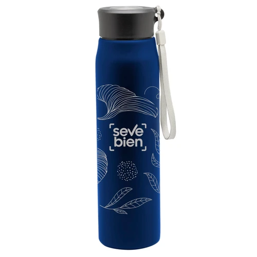Ø 6,5 x 25 cm. Capacidad 800ml. Acero inoxidable. Botella de acero inoxidable 304. Tapa combinada en plástico y acero inoxidable 201 con tira de color gris de 12 cm de largo. Ideal para llevarla a todos lados. Presentación en caja de regalo.