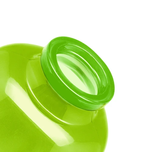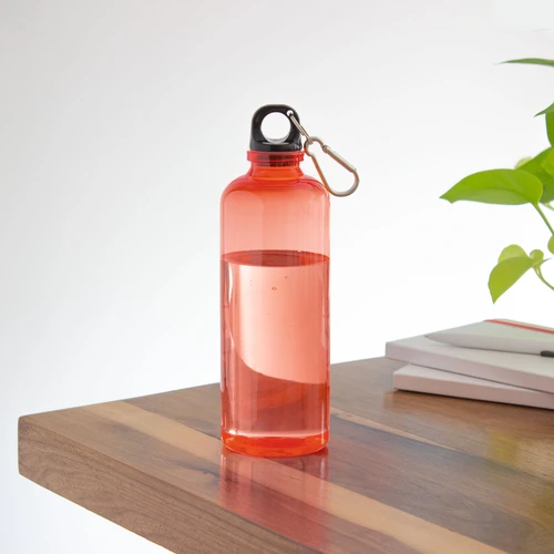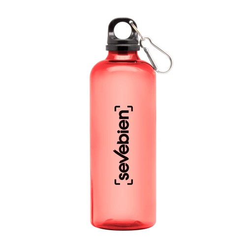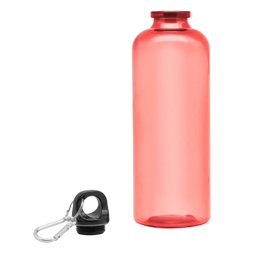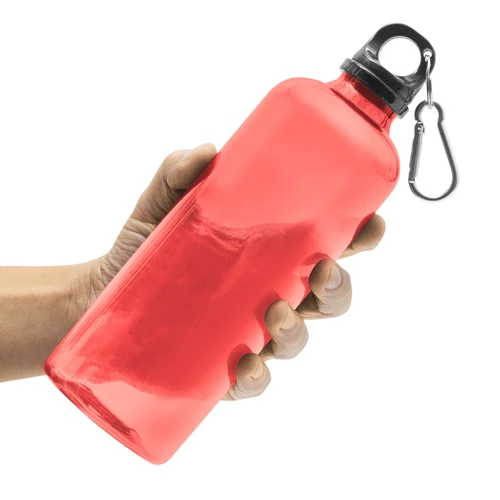 Ø 7 x 23 cm. Capacidad 600 ml. Material PET. Botella de plástico de colores translúcidos. Tapa a rosca en color negro con anillo de silicona y mosquetón de aluminio plata. Ultra liviana, pesa 60g.ATENCIÓN No utilizar con bebidas gaseosas ni líquidos calientes. / El manejo de este producto es delicado. / No exponer al sol y temperaturas altas por tiempo prolongado.