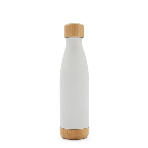 Botella térmica de doble pared de acero inoxidable y tapa de bambú con capacidad de 500 ml. Mantiene las bebidas frías por 24 horas y calientes durante 12 horas. Ideal para deporte o uso diario.