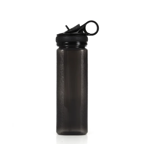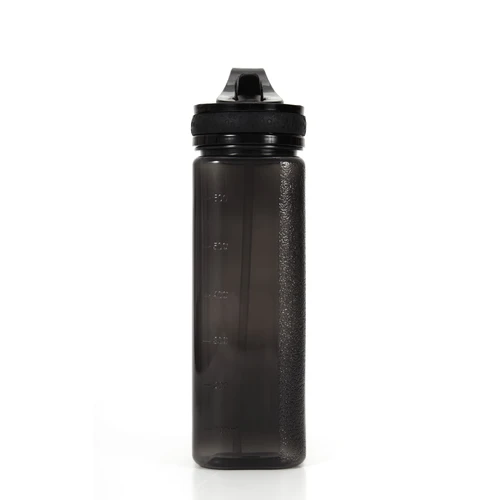 Botella de PP con boquilla vertedora deportiva. Cuenta con un agarre en la tapa. Medida: 23,7 cm x 6,2 cm. Capacidad: 650 ml.