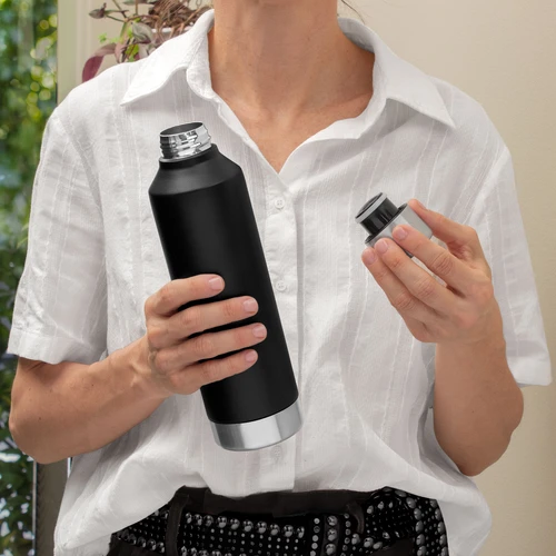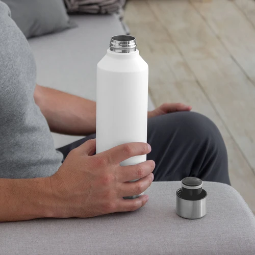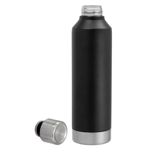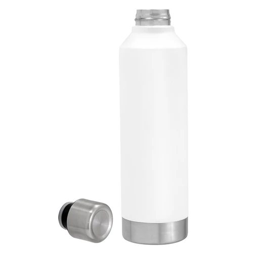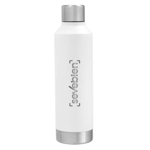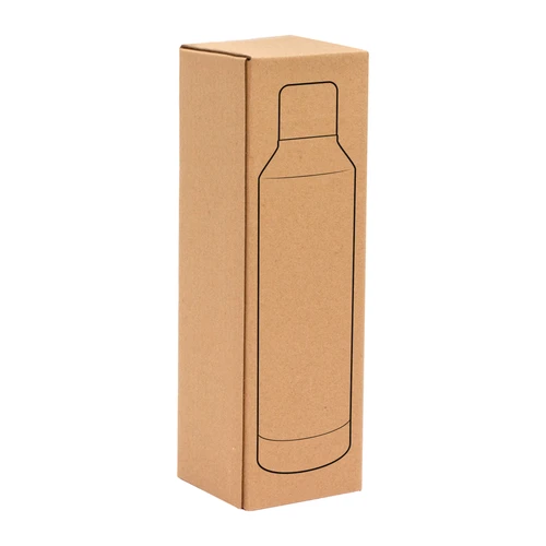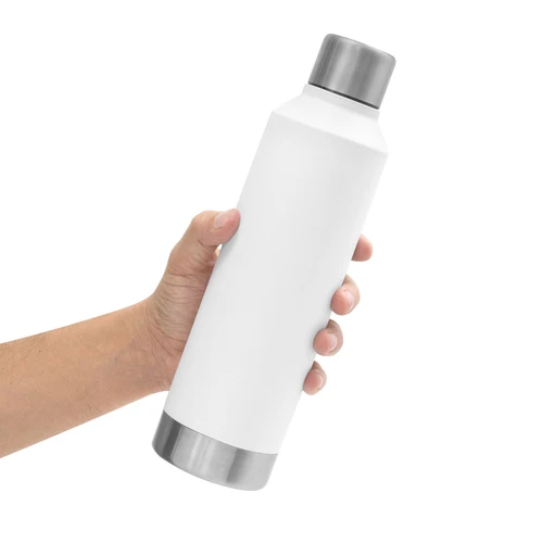 Ø 7 x 25 cm. Capacidad 550 ml. Acero inoxidable. Botella doble pared, sellada al vacío. Interior en acero 304 y exterior en acero 201. Tapa de acero 201 a rosca con anillo de silicona. Pintura Powder coat (pintura más duradera y resistente a la corrosión y el paso del tiempo). Mantiene hasta 8 hs la temperatura de las bebidas calientes y hasta 12 hs la de las bebidas frías. Presentación en caja de regalo Kraft.