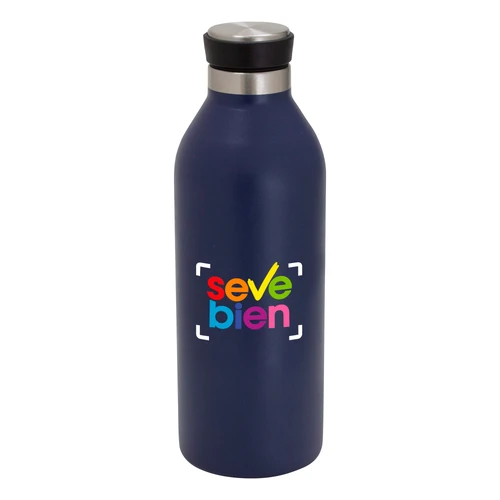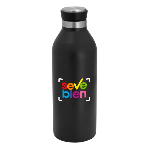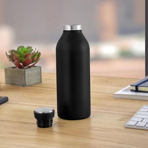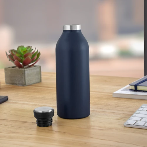 Ø 7,2 cm x 21,5 cm. Capacidad 500 ml. Acero inoxidable. Botella doble pared, sellada al vacío. Interior en acero 304 y exterior en acero 201. Pintura acabado mate. Tapa de polipropileno, acero inoxidable 201 y anillo de silicona. Mantiene hasta 8 hs la temperatura de las bebidas calientes y hasta 12 hs la de las bebidas frías. Presentación en caja de regalo kraft.
