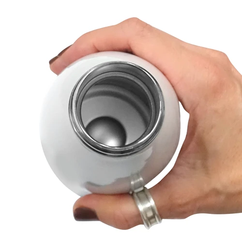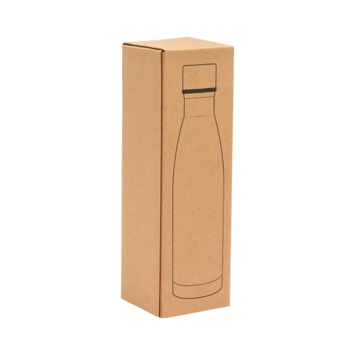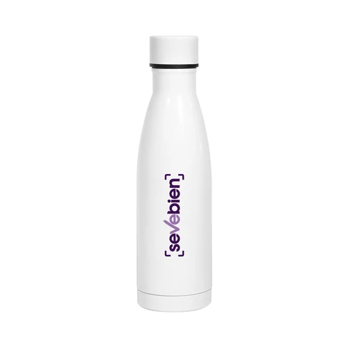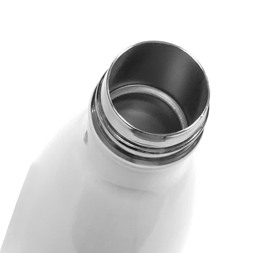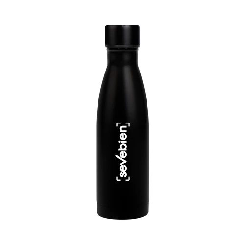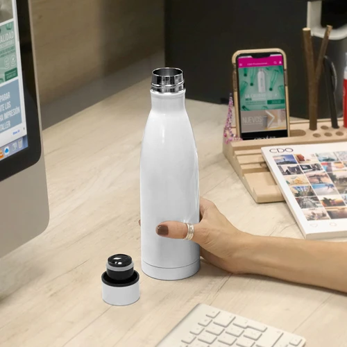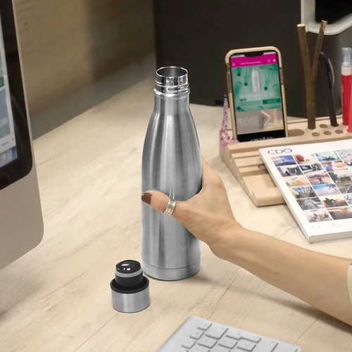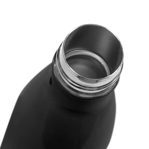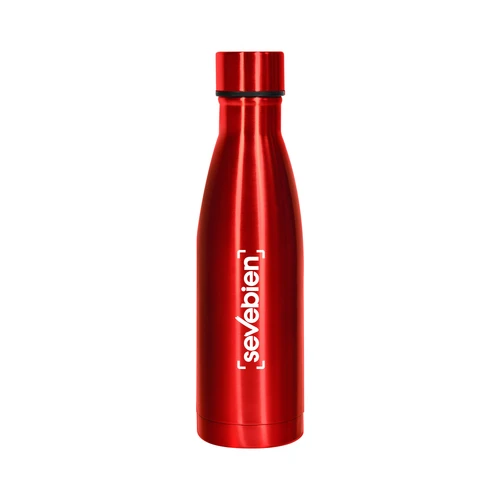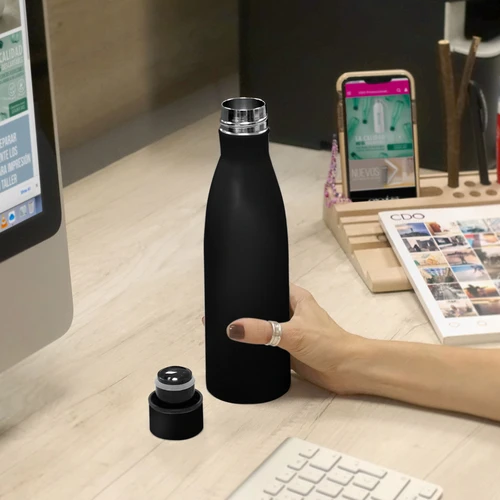 Ø 7 x 25,5 cm. Capacidad 500 ml. Acero inoxidable. Botella doble pared, sellada al vacío. Interior de acero 304 y exterior de acero 201. Cuerpo y tapa a rosca del mismo color. Mantiene hasta 8 hs la temperatura de las bebidas calientes y hasta 12 hs la de las bebidas frías. Presentación en caja de regalo.
