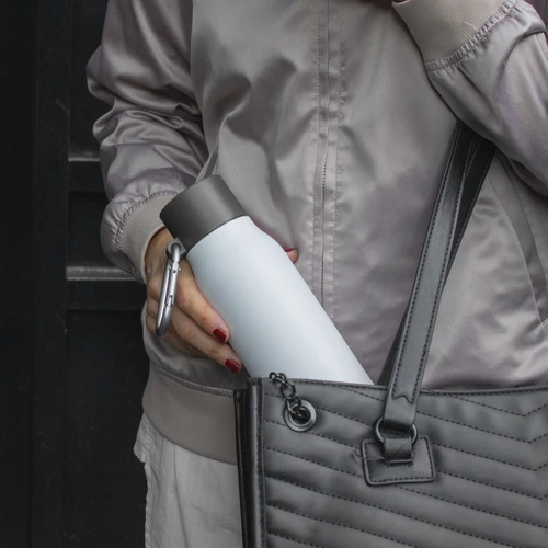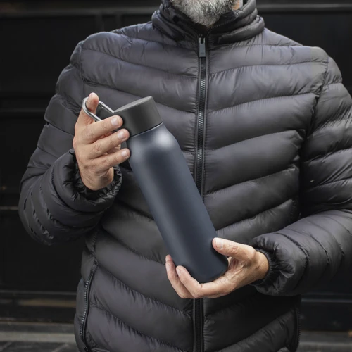 Acero reciclado, resistencia aseguradaBotella doble pared, sellada al vacío. Interior en acero 304 reciclado y exterior en acero 201. Pintura powder coat (pintura más duradera y resistente a la corrosión y el paso del tiempo). Tapa plástica de polipropileno y anillo de silicona con mosquetón de aluminio. Mantiene hasta 12 hs la temperatura de las bebidas calientes y hasta 24 hs la de las bebidas frías. Medidas: Ø 6,5cm x 25 cm.
